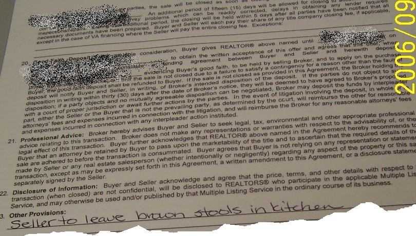 Of course, this being my life, certain things about the purchase turned out......interesting. If you check out the picture, you will notice some really nice custom leather seats along the kitchen counter. The counter height is non-standard; but these seats fit absolutely perfectly. We decided we wanted the seller to leave them, so we asked our realtor to write this into the contract. This is how that turned out.