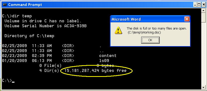 MS Word, in response to this attempt, refused to save the document. MS Word is insisting that I've run out of space on my C: drive as well. Now, I realize some of you probably think that 15+ Gig of free space might seem a bit meager, but it should be more than enough to save this document.